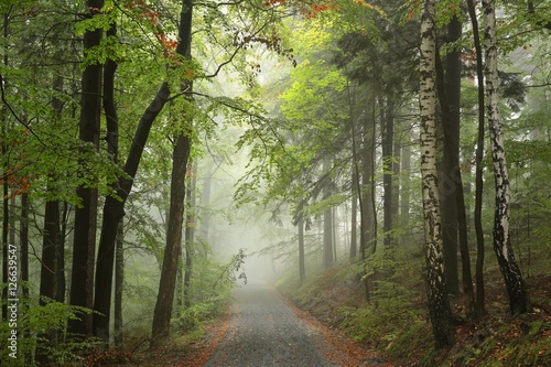 © Aniszewski, Obraz premium Forest path on a misty weather at the beginning of autumn