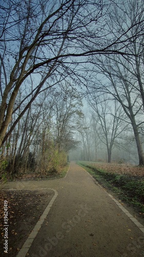 Fototapeta premium Forest path on foggy autumn morning