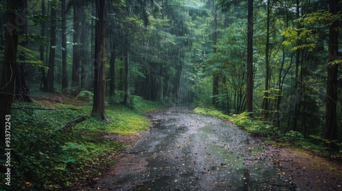 Obraz premium Forest path photo , Raining in forest , Serene forest scene , Peaceful forest...