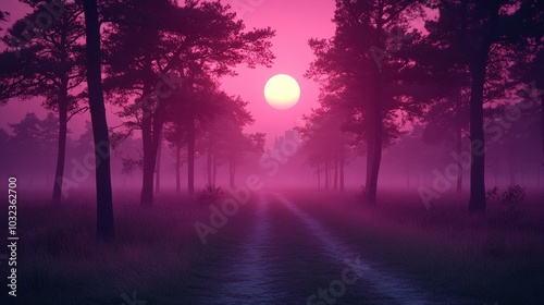 Fototapeta premium forest path shrouded in pink mist under a full moon, illustration, wallpaper