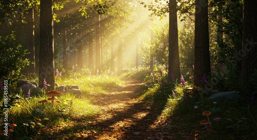 © Alleuy, Obraz premium Forest path sunlight through trees nature landscape