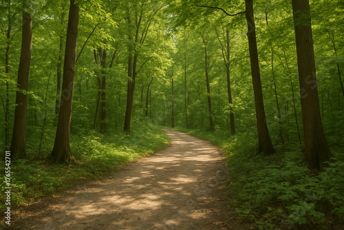 Naklejka premium Forest path surrounded by green trees in sunlight
