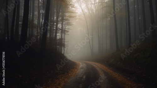 © Chirayu stock, Naklejka premium Forest Path Through Misty Woods A Serene Journey into the Heart of Nature s Enigmatic Embrace