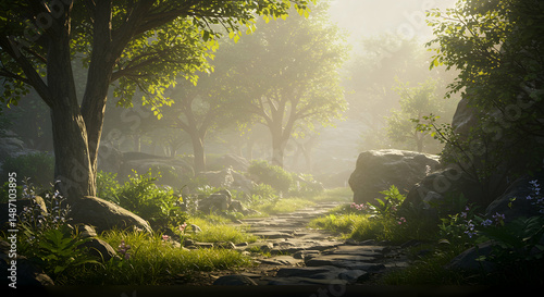 Obraz premium forest, path, trail, Misty Forest Path at Sunrise
