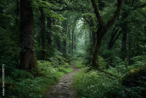 © mattegg, Obraz premium Forest path winding through a lush green summer forest