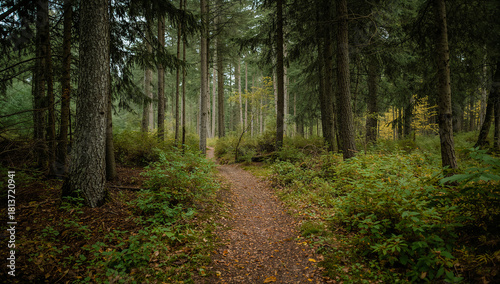 © janzwolinski, Fototapeta premium Forest path winding through a lush green woodland with tall trees and foliage