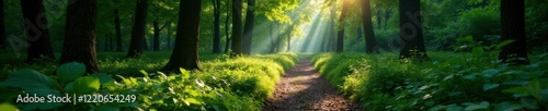 Obraz premium Forest path winding through dense undergrowth, landscape, trail, trees