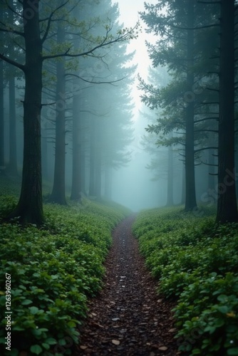 © Prayoon, Naklejka premium Forest path winding through misty foggy landscape, wood grain, foggy day, misty morning