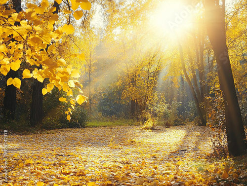 © ILIUSIA, Obraz premium Forest path with golden leaves and a calm atmosphere, sunny park.