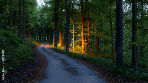 © Khoeriyah, Naklejka premium Forest Path With Golden Light At Twilight