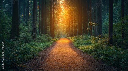 © jinna, Fototapeta premium Forest Path with Golden Sunlight