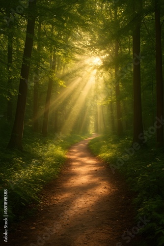 Fototapeta premium forest path with golden sunlight shining through trees