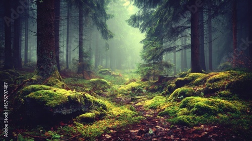 Obraz premium Forest Path with Green Moss and Tall Trees