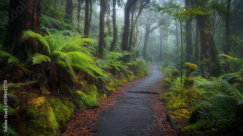 © Rahela2Studio, Obraz premium Forest path with moss and fallen leaves