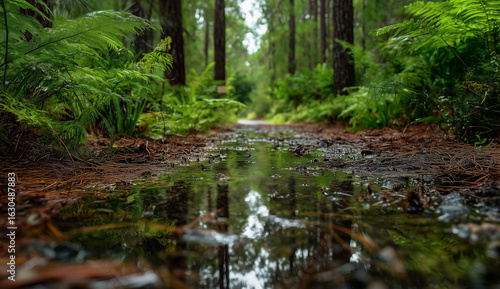 © wcbxyz , Fototapeta premium Forest path with puddle reflecting trees and ferns