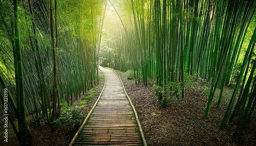 © PandaUniverse, Obraz premium forest path with soft green lighting, top