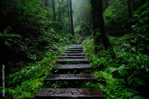 Obraz premium Forest path with stairs ascends through lush, dense woodland in misty...