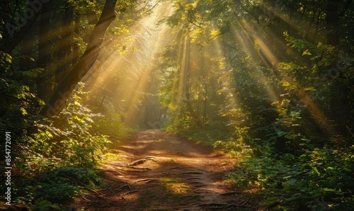 © Innovator587, Naklejka premium Forest path with sunbeams