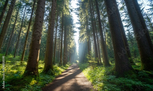 Obraz premium Forest path with sunbeams shining through tall trees on a sunny day for tourism