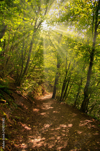 © Claudia Nass, Obraz premium forest path with sunbeams shining through the trees