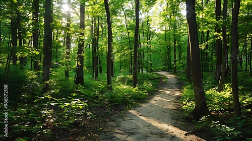 © Iman00, Obraz premium Forest Path with Sunlight Filtering Through Trees
