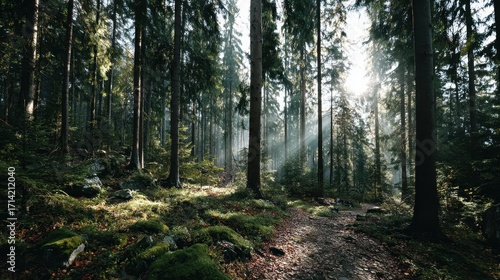 © MUHAMMADJAYA, Obraz premium Forest Path with Sunlight Rays