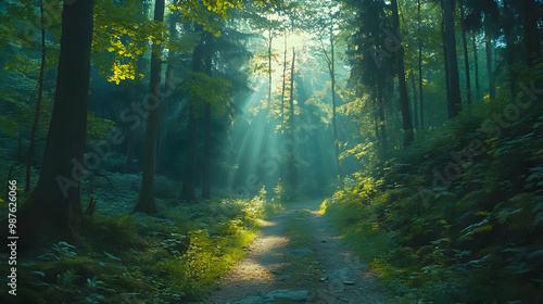© embun, Obraz premium Forest Path with Sunlight Rays Illustration