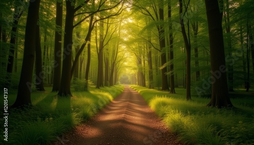 © Aleks, Obraz premium Forest path with sunlight streaming through lush green trees