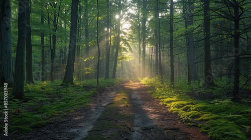 Obraz premium Forest path with sunlight streaming through the trees creating a magical...