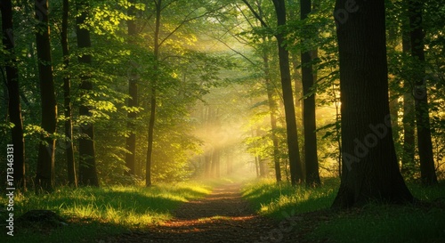 Obraz premium Forest path with sunlight streaming through trees illuminating the ground