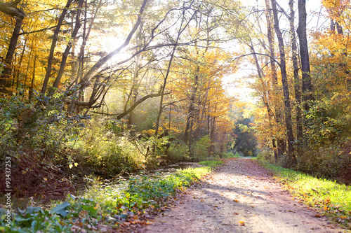 © Christin Lola, Fototapeta premium Forest Path with Trees Arched over Trail in Evening