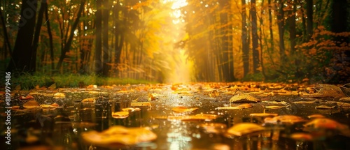 Naklejka premium Forest path with wet ground and yellow leaves, surrounded by green foliage and tall trees, glistening leaves, softly blurred background for serene atmosphere