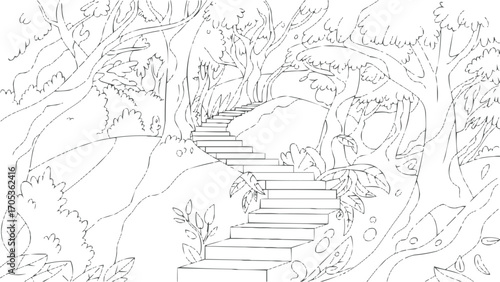 Fototapeta premium Forest pathway illustration with stone staircase leading through trees line art drawing for coloring book and t shirt design
