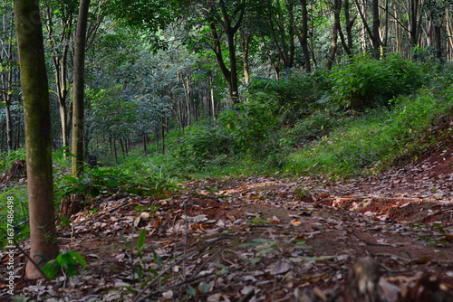 © Sis, Obraz premium Forest pathway leading through dense trees with green leafy canopy