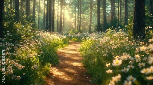 Fototapeta premium Forest pathway nature concept. A serene forest path surrounded by blooming flowers and sunlight filtering through trees.