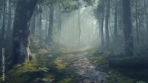 © @foxfotoco, Obraz premium Forest Pathway with Sunlight Beams