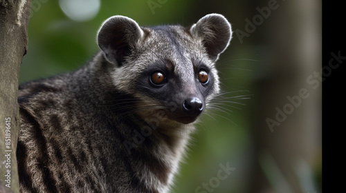 Fototapeta premium "Forest Phantom: African Palm Civet Amidst Blurred Greenery"