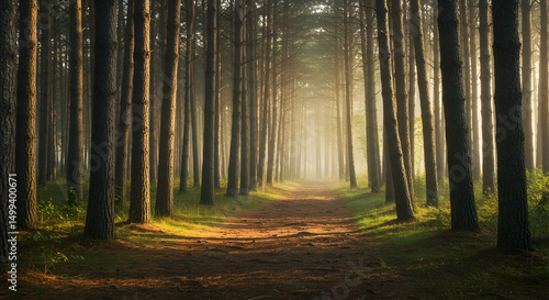 © sarinya, Fototapeta premium Forest, Pine forest, Trees, Sunlit Path Through Misty Pine Forest
