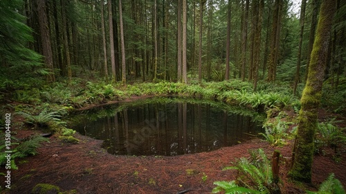 © Berkah1789, Obraz premium Forest Pond Reflecting Trees and Ferns