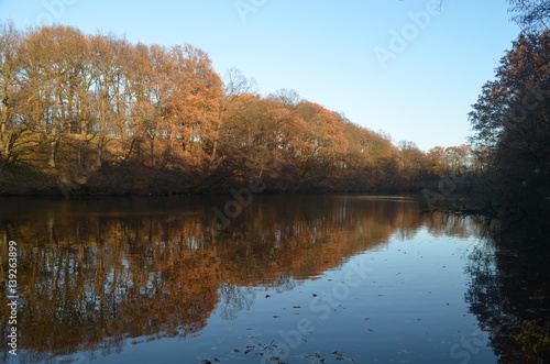 © lembrechtsjonas, Fototapeta premium forest reflecting in lake on autumn day