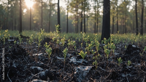Obraz premium Forest renewal after wildfire with young green shoots sprouting from charred ground
