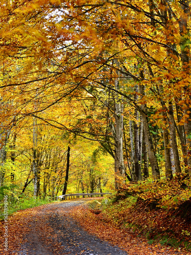 Obraz premium Forest road among tall trees dressed in autumn colours