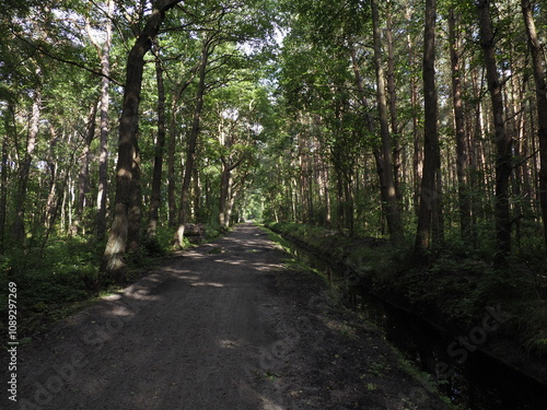 Fototapeta premium Forest road among tall trees on a summer day with shadows and light