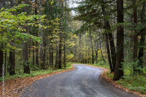 © Sergei Malkov, Fototapeta premium Forest Road. Asphalt tape winds between trees. Autumn forest