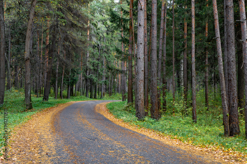 Fototapeta premium Forest Road. Asphalt tape winds between trees. Autumn forest