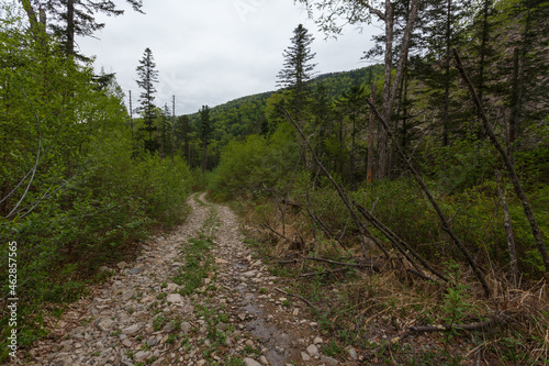 Naklejka premium Forest Road. Bad forest road in the Russian taiga. An old timber road in the taiga.