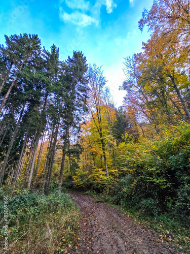 © Nadiia, Fototapeta premium Forest Road Beneath the Autumn Sky