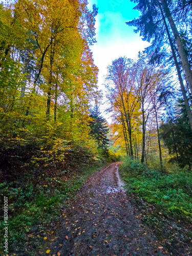 © Nadiia, Fototapeta premium Forest Road Beneath the Autumn Sky