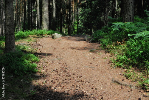 Fototapeta premium Forest road covered with pine needles on a sunny summer day.