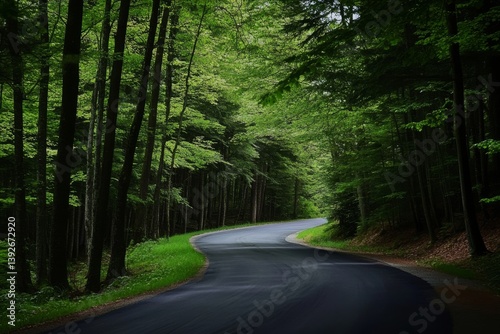 © senyumanmu, Fototapeta premium Forest road curves beneath green canopy